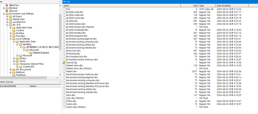 -> [root]\Documents and Settings\Mr. Evil\Local Settings\Application Data\Identities{EF086998-1115-4ECD-9B13-9ADC067B4929}\Microsoft\Outlook Express~~