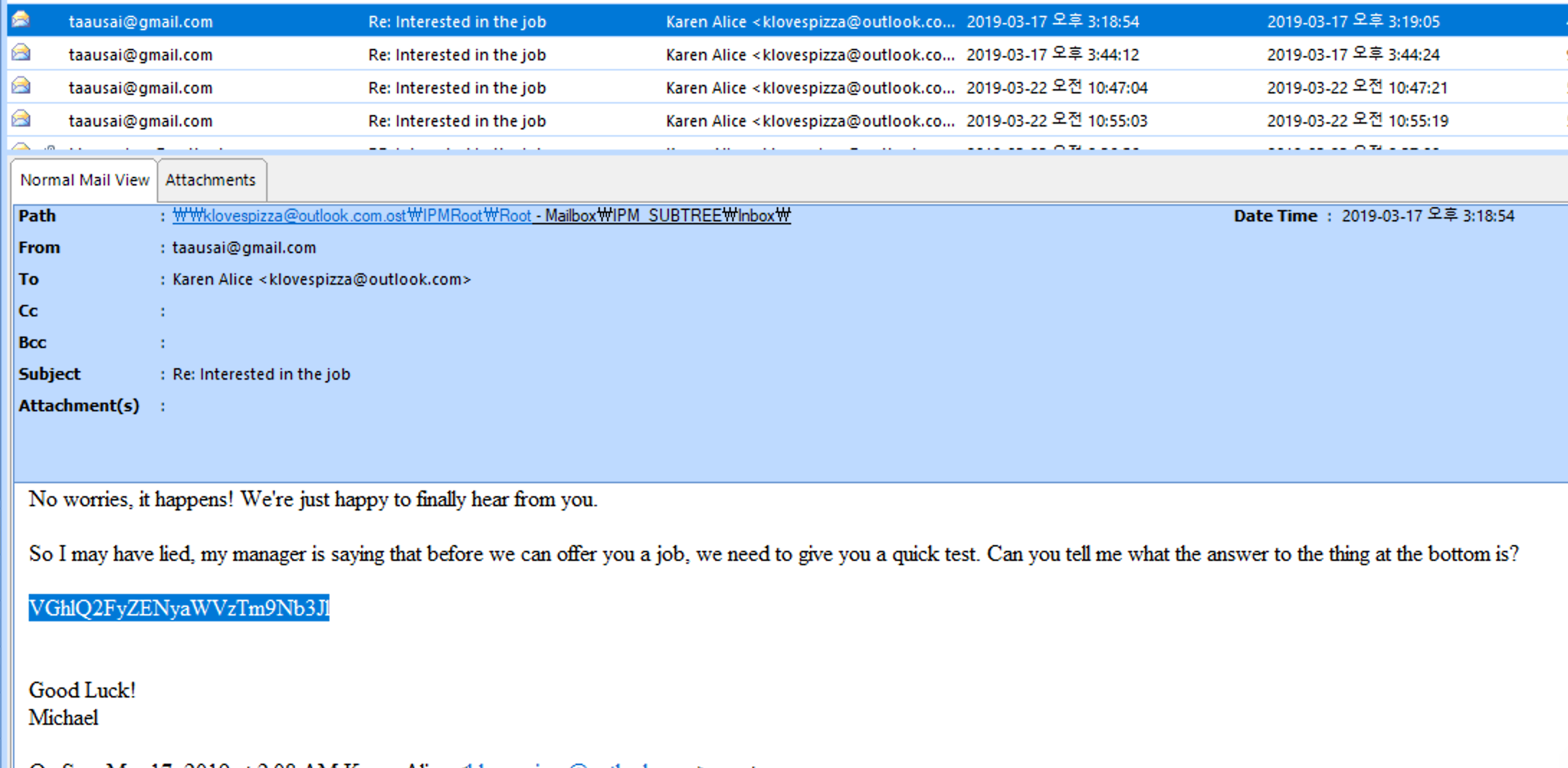 메일을 둘러보던 도중, 특정 암호 구문이 존재했습니다.