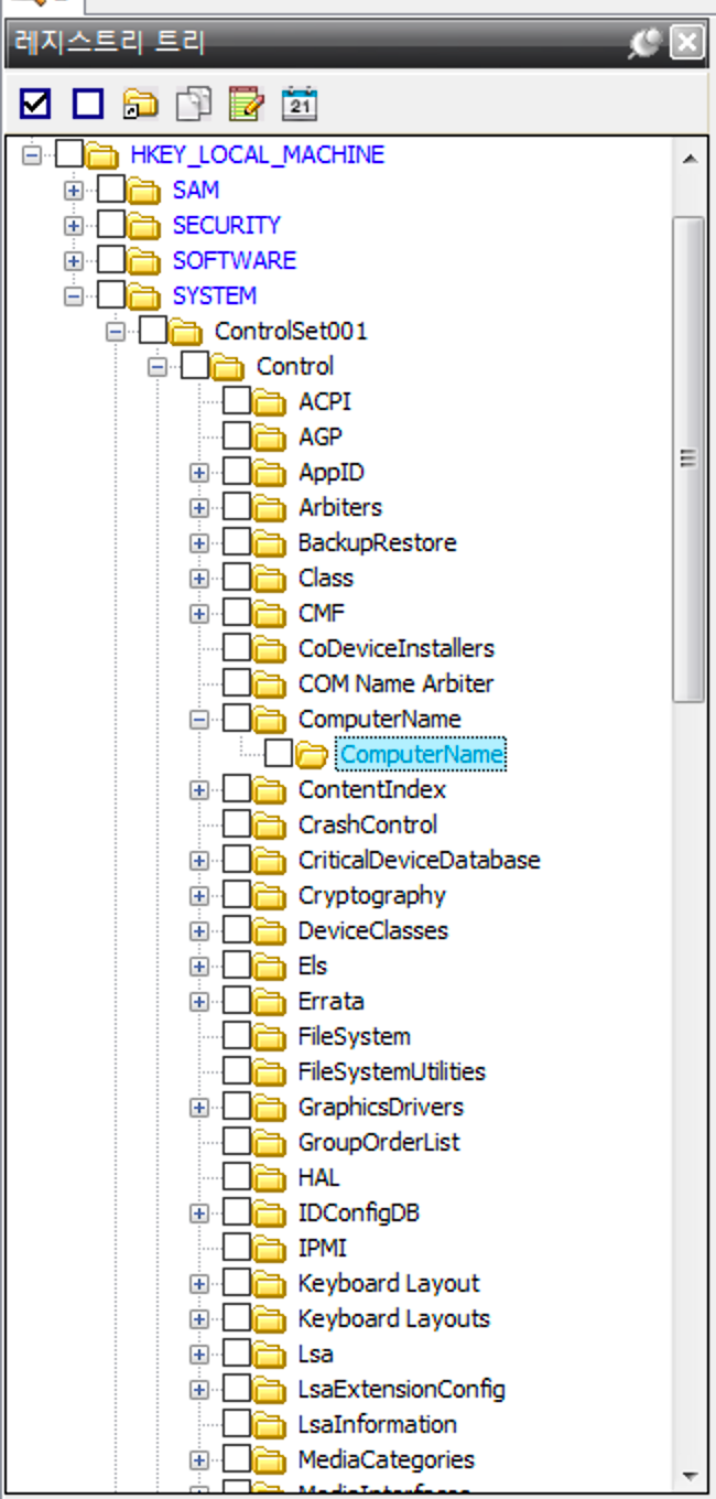 ControlSet00x\Control\ComputerName\ComputerName 측 경로를 확인하면, 위처럼 해당 키 값을 확인할 수 있습니다.