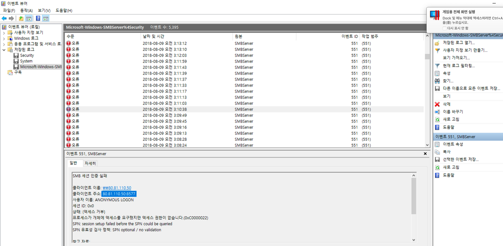 이벤트 뷰어로 해당 시간대 2018-08-08 18:10:38.554 (UTC) | 2018-08-09 03:10:38.554 (UTC +9)
