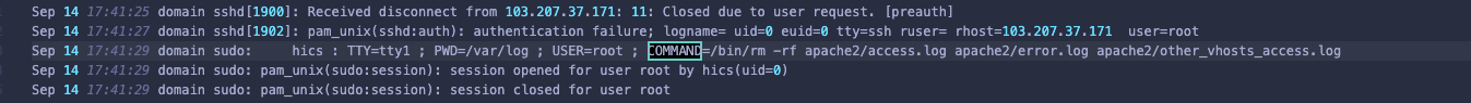 Sep 14 17:36:34 domain sudo: hics : TTY=tty1 ; PWD=/home/hics ; USER=root ; COMMAND=/sbin/mkfs -t ext4 /dev/sdb1 Sep 14 17:36:35 domain sudo: hics : TTY=tty1 ; PWD=/home/hics ; USER=root ; COMMAND=/sbin/mkfs -t ext4 /dev/sdb2 Sep 14 17:41:29 domain sudo: hics : TTY=tty1 ; PWD=/var/log ; USER=root ; COMMAND=/bin/rm -rf apache2/access.log apache2/error.log apache2/other_vhosts_access.log Sep 14 17:41:50 domain sudo: hics : TTY=tty1 ; PWD=/ ; USER=root ; COMMAND=/bin/mount /dev/sdb1 /home/hics/ Sep 14 17:42:03 domain sudo: hics : TTY=tty1 ; PWD=/ ; USER=root ; COMMAND=/bin/mount /dev/sdb2 /var/log/apache2/