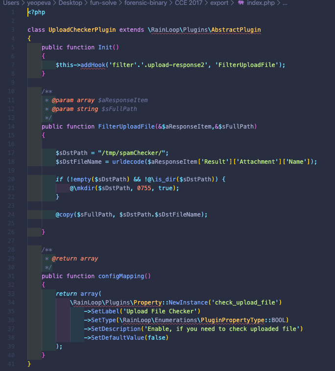 public function FilterUploadFile(&$aResponseItem,&$sFullPath) { $sDstPath = "/tmp/spamChecker/"; $sDstFileName = urldecode($aResponseItem['Result']['Attachment']['Name']); if (!empty($sDstPath) && !@\\is_dir($sDstPath)) { @\\mkdir($sDstPath, 0755, true); } @copy($sFullPath, $sDstPath.$sDstFileName); }