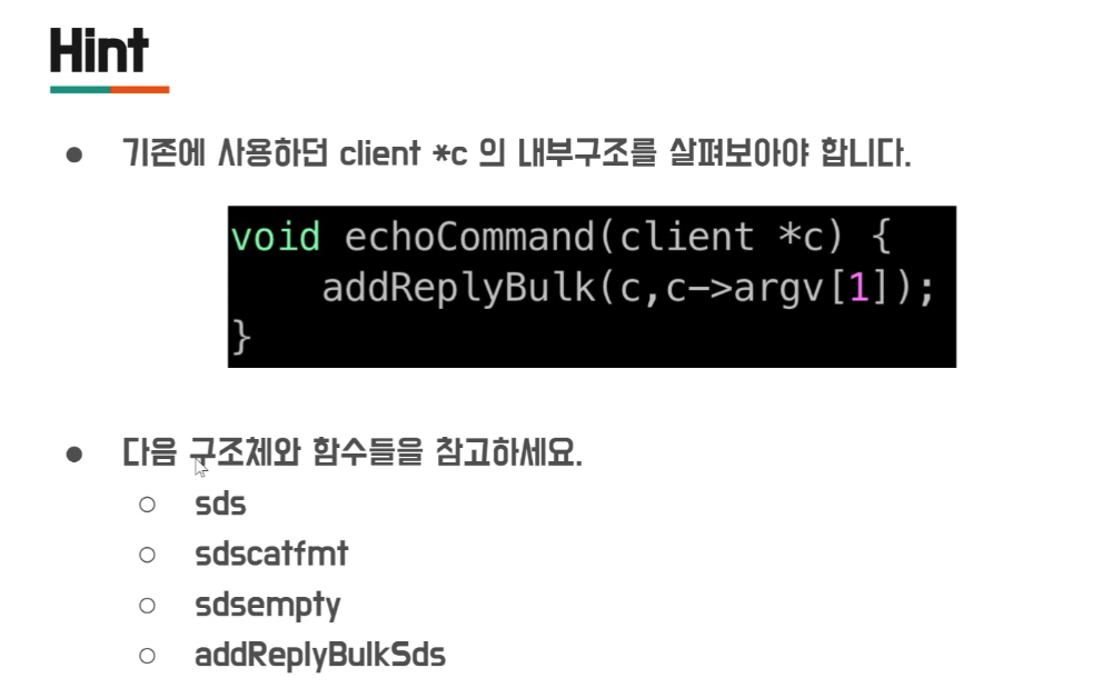 멘토님이 알려주신 코드와 비교시, c→argv[1]→ptr을 통해 sds 문자열을 “echo_2”에 붙여주는 형태로 동작하며, addReplyBulkSds()를 통해 RESP 형식으로 클라이언트에게 반환 후, 자동으로 해제되는 형태로 진행됩니다.